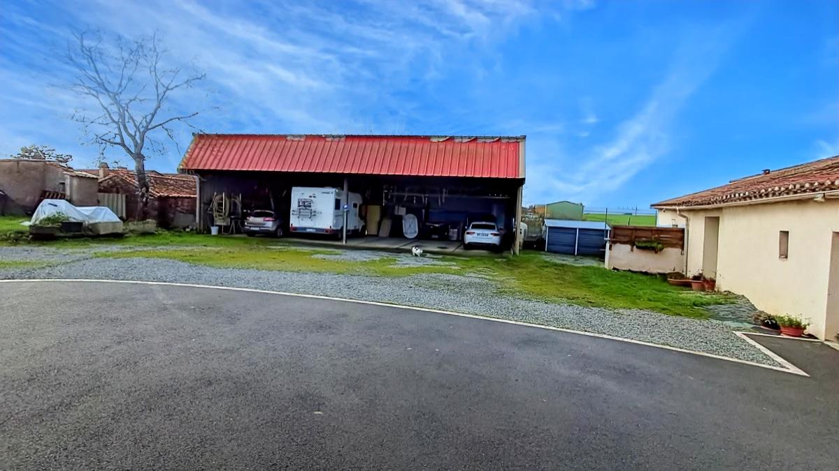 Dépendances et extérieur grand hangar de 165 m² environ sur dalle béton, équipé de panneaux solaires (installés en 2021) générant des revenus annuels de 3000 € environ.